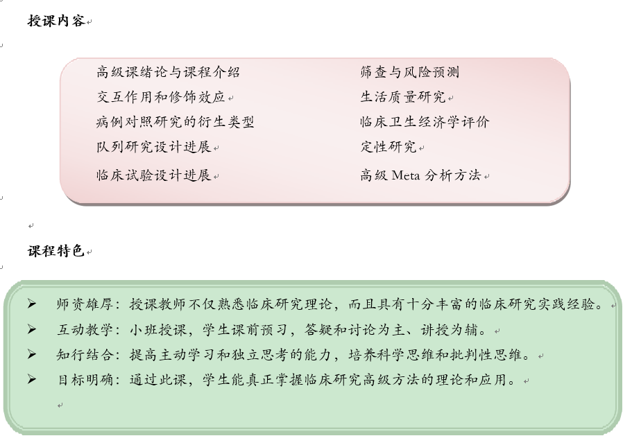 临床研究方法(高级)课程将在学生掌握临床研究方法(基础)课程的基础上,通过自我学习和互动式、讨论式教学模式,引导学生深入地学习高级临床研究方法,掌握临床研究设计方法进展,拓宽独立开展临床研究所需知识面,进而提高独立思考和开展临床研究的能力。该课程的设立将有助于我国临床研究高级人才的培养和促进我校临床研究水平提高。